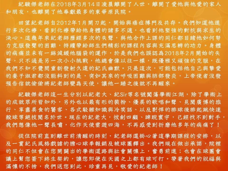 舉辦「紀駿傑教授追思紀念會」。這回我們想用笑聲、歌聲、紀式幽默,和影音來懷念紀Sir。
